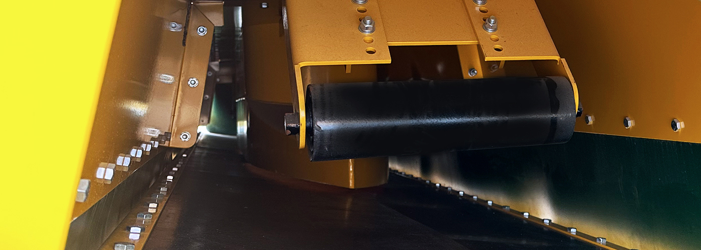 拉鏈式蓋帶機以搭接形式沿帶式輸送機布置兩塊傾斜彈性蓋帶,船型拉鏈機構(gòu)插入蓋帶下方,隨上方輸送設(shè)備卸料點變化而靈活運動,實現(xiàn)進料。